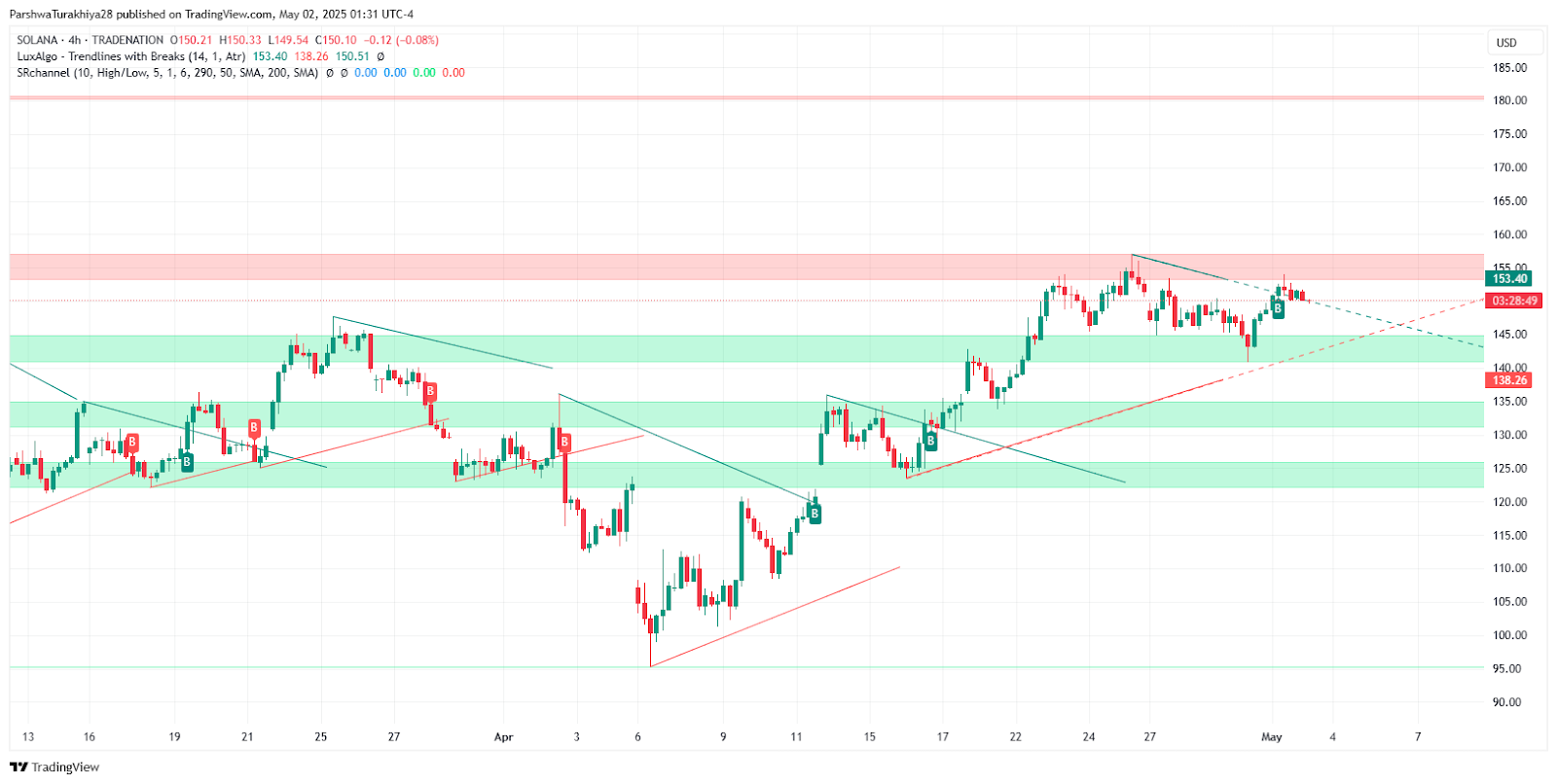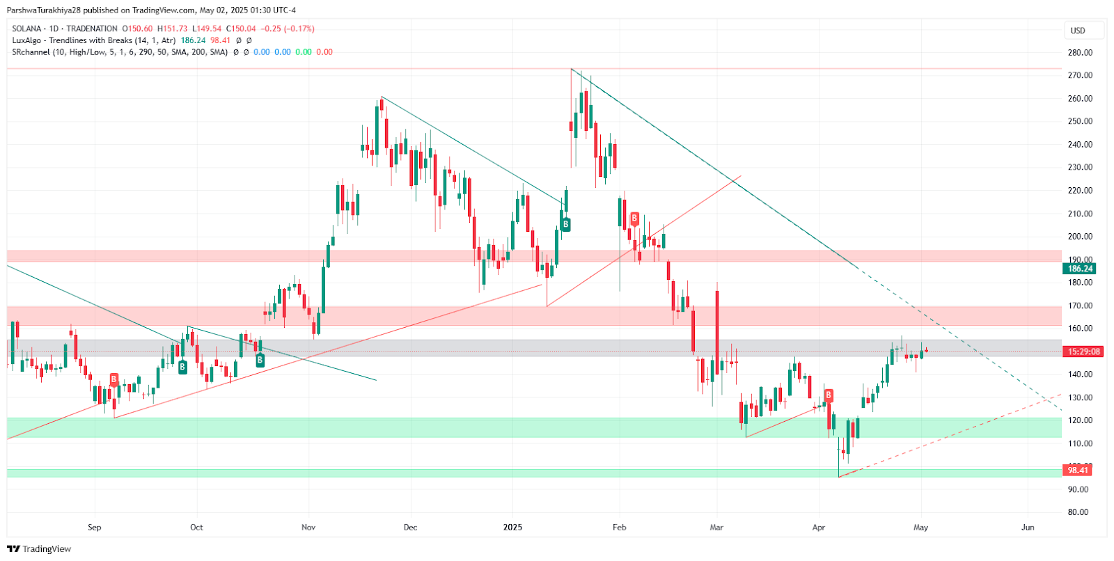 Solana ($SOL) begins May 2025 trading near the $150 mark, having staged an impressive recovery from April’s lows around $115. The asset is now approaching a critical resistance zone between $153 and $155, defined by a descending trendline that has capped upward momentum since February. This setup places Solana at a technical inflection point, with either a breakout or rejection likely to dictate its direction in the weeks ahead.