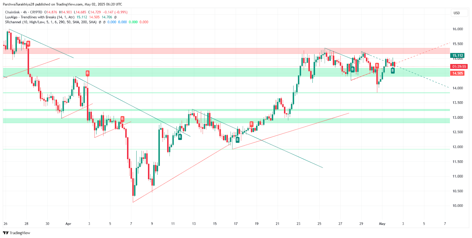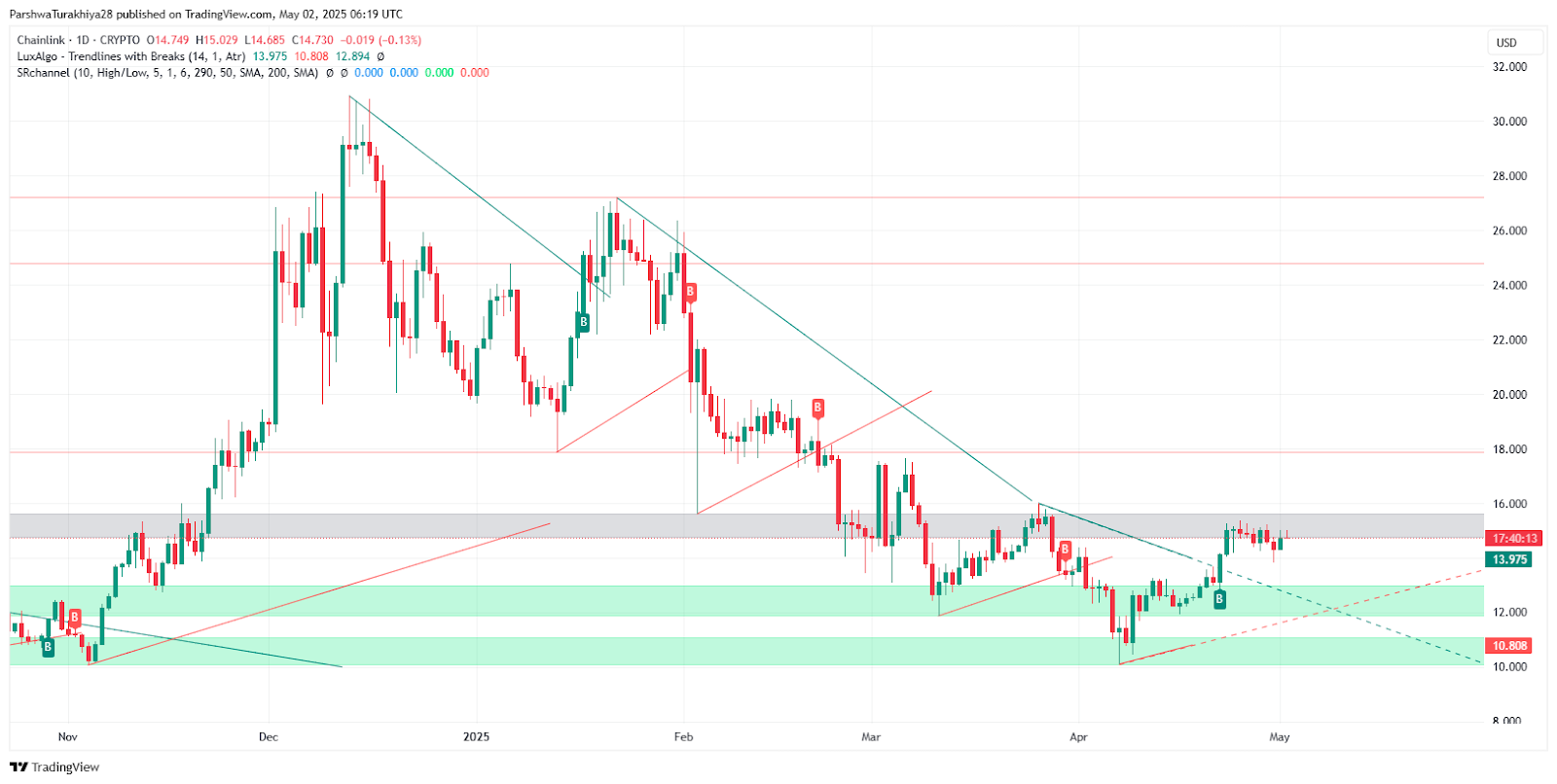 Chainlink (LINK) is at a technical inflection point. With a breakout structure on the daily chart and tightening price action on lower timeframes, May 2025 could witness a decisive move. A bullish breakout above $15.30 would target the $16.80–$19.50 zone. On the flip side, a breakdown below $13.90 might bring renewed selling pressure. Until a directional breakout occurs, expect choppy range-bound trading.
