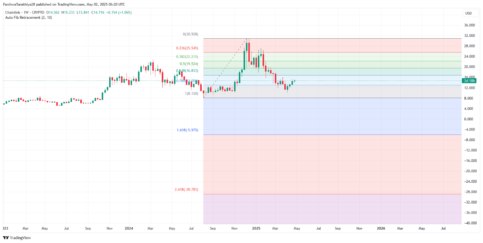 LINK is currently hovering near the 0.618 Fibonacci retracement level at $14.71, drawn from the $30.92 high to the $8.12 low. This zone has historically been a pivot for strong reversals. The bullish attempt to defend this level could provide the base for a rally towards the 0.5 Fib level at $19.52.