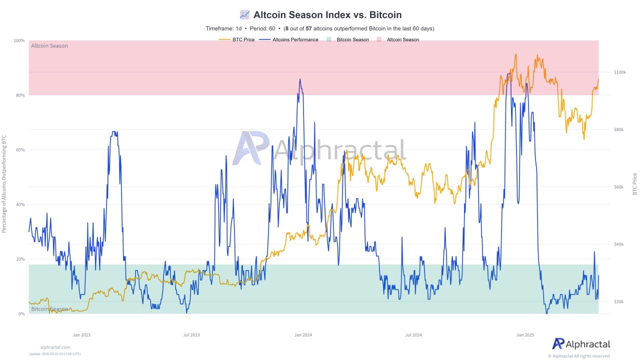 The Altcoin Seasonality Index, used by Alphractal, has revealed that only a few altcoins have outperformed Bitcoin based on performance over the past 60 days. These exceptional altcoins are usually new entrants to the market. In contrast, altcoins that have been around for a long time continue to perform poorly.