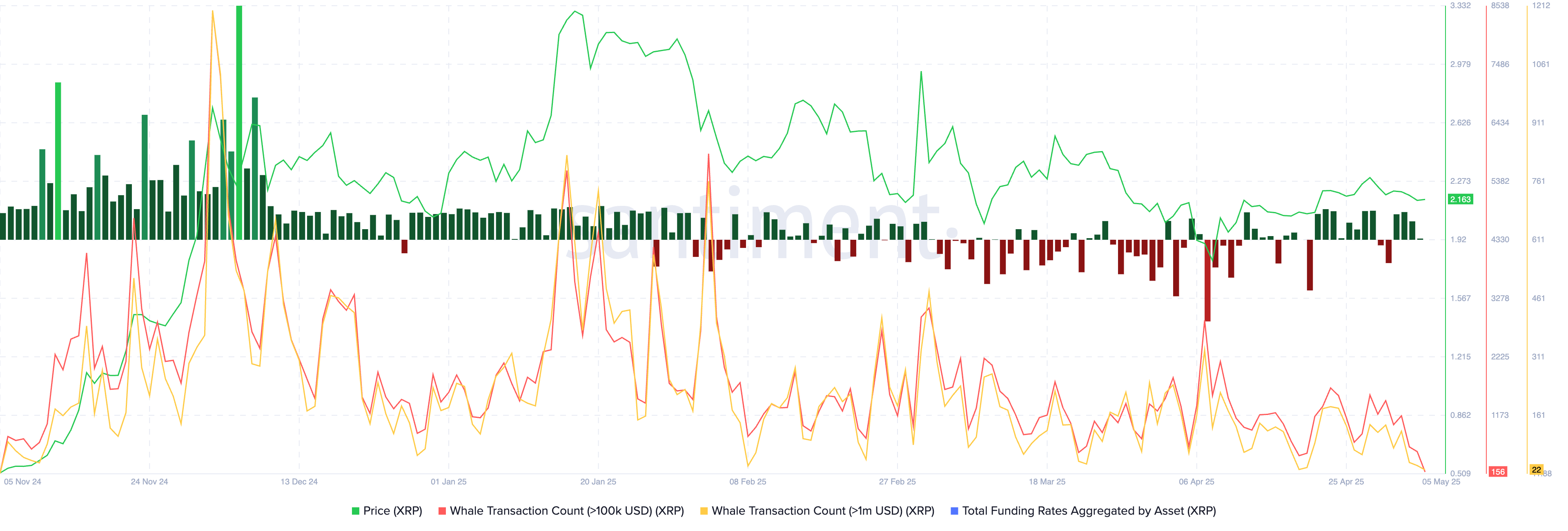 XRP whale transactions in two segments, valued at $100,000 and higher and greater than $1 million declined, as seen on on-chain intelligence platform Santiment. A decline in whale transactions typically signals a loss in interest, however aggregate funding rates by XRP flash a green histogram bar, supporting a thesis that there is demand for XRP.