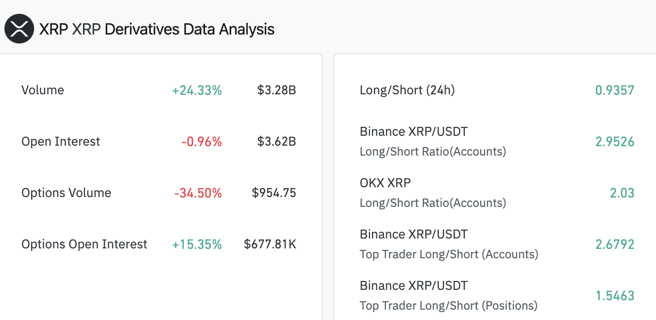 Data from Coinglass shows, XRP volume is up 24% and open interest, the net volume of all open derivatives contracts is down less than 1% in the last 24 hours. The long/short ratio is under 1, meaning derivatives traders are not yet bullish, at the start of the week.