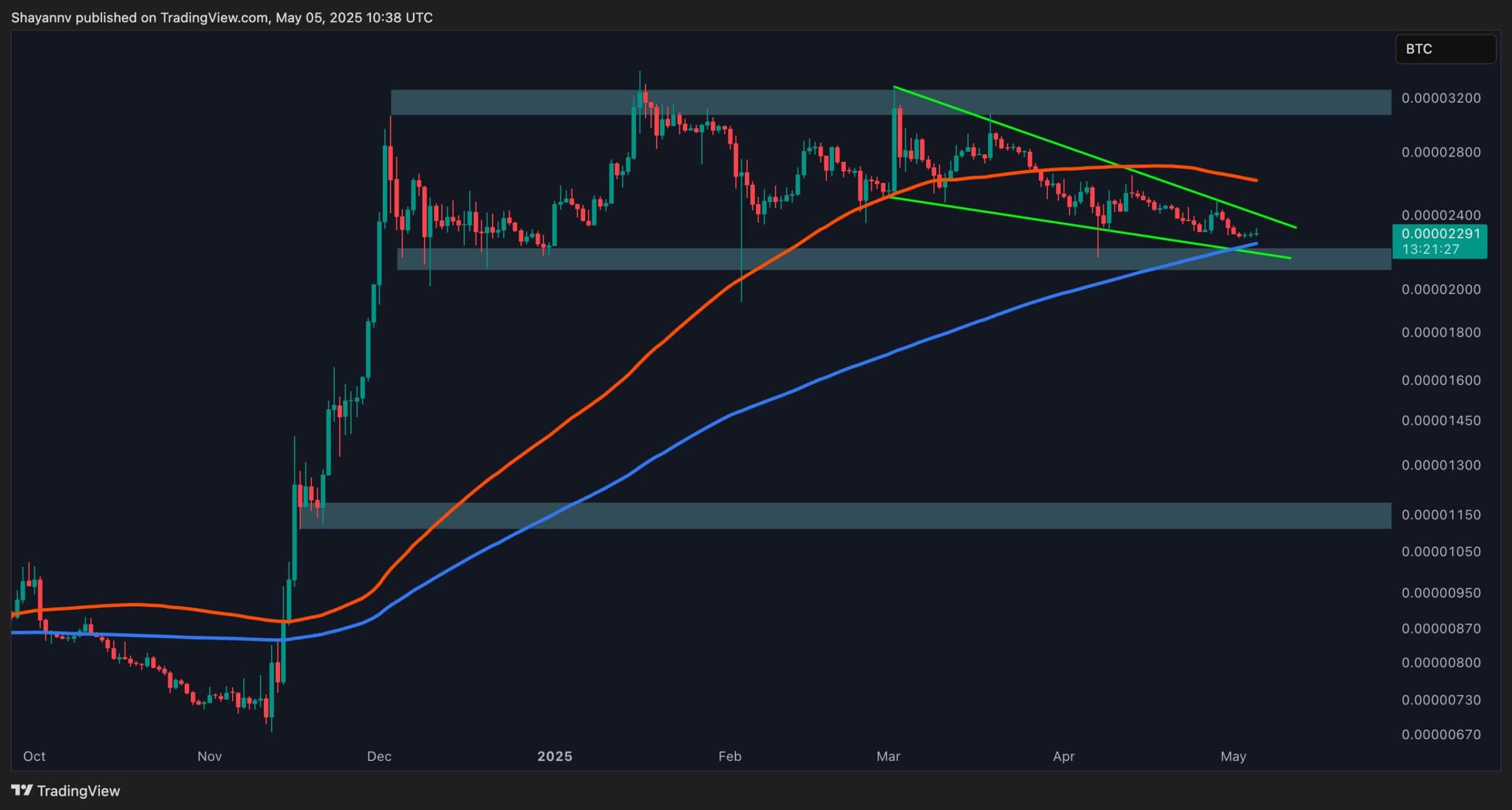 This level has been held multiple times and coincides with the 200-day moving average. The wedge pattern typically resolves to the upside, but XRP still needs to break out and reclaim 2400–2450 SAT to generate any bullish momentum. Until then, the downtrend structure remains intact.