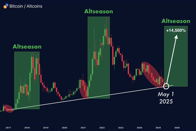 Strong gains for many altcoins followed these points. The analysis includes a projection suggesting the current timeframe, around May 2025, could represent another such potential turning point.