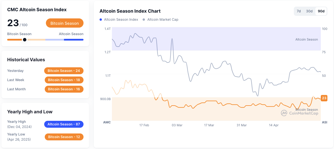 While the index showed small gains recently, climbing from a yearly low of 12 on April 26, through 16 and 18, to the current 24, it remains far too low to signal an incoming altcoin surge. Despite this increase, the general trend suggests that investor capital concentrates on Bitcoin.