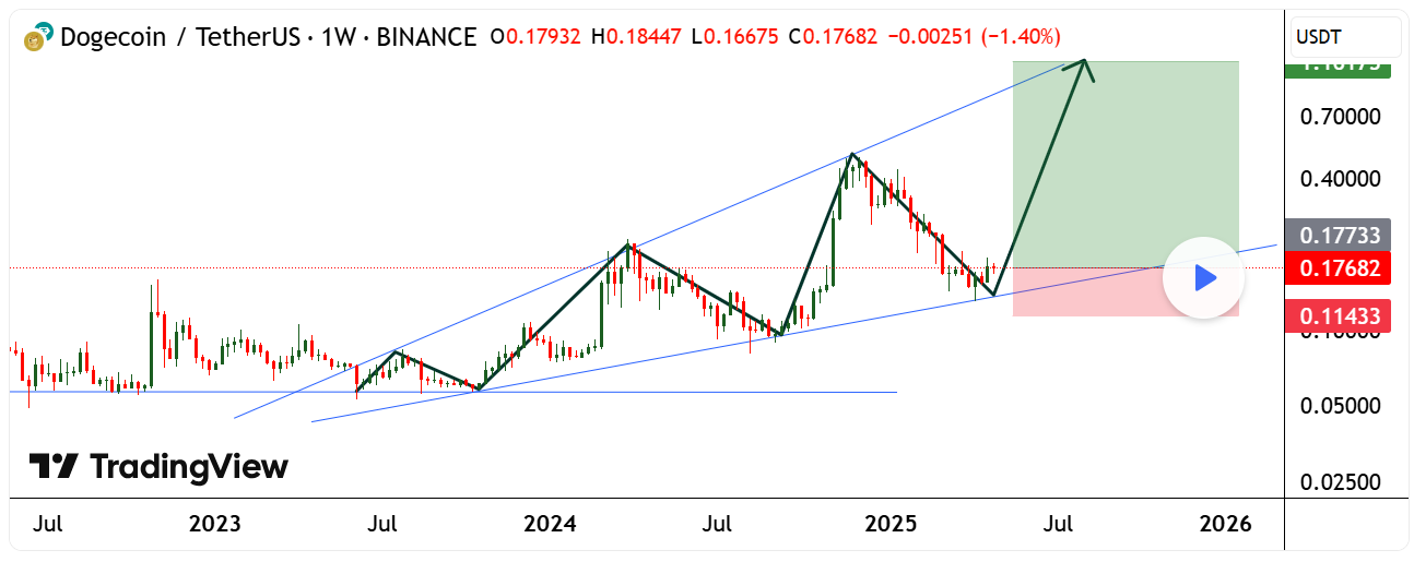 A new weekly chart by analyst GreenCrypto on TradingView shows that Dogecoin is forming an Ascending Wedge pattern, which is a sign of a long-term upward trend since 2023. If the pattern continues, Doge could break out and register a new all-time high of $1.161 with 582% gain.