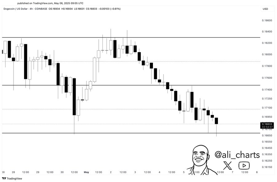 Analyst Ali Martinez recently shared that DOGE is testing a key support level at $0.167. If it manages to hold above this level, then it could rebound to $0.175 and even rally up to $0.183.