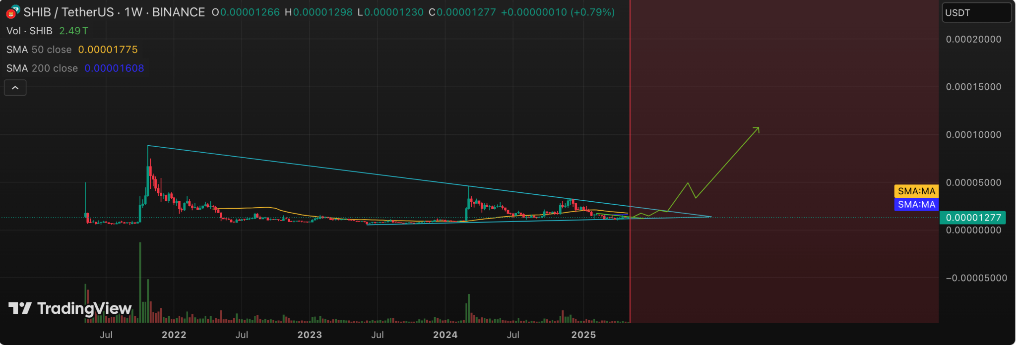 As the triangle’s apex nears, the chart now outlines a speculative breakout path, targeting initial resistance at the 50-day simple moving average (SMA 50), positioned near $0.000017.