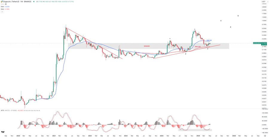 Analyst Maelius Crypto shared a chart calling Doge ‘incredible’ even though it dropped more than expected. The analyst thinks Dogecoin is showing strong signs of a breakout as price has bounced off key support levels, like the 200-week EMA and a demand zone between $0.11 and $0.20.