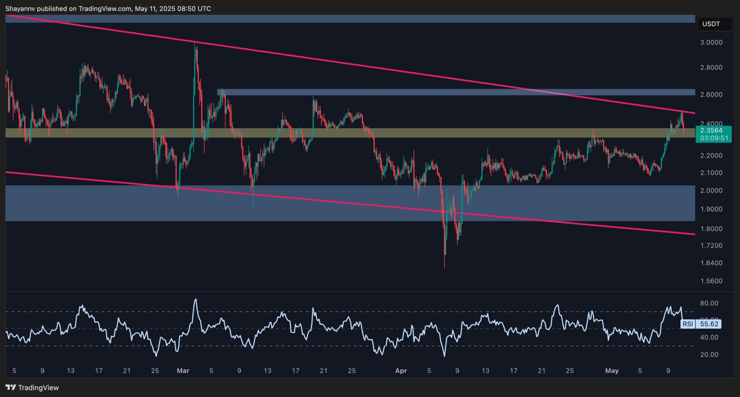 Following an influx of buyers at the key 200-day moving average support near $2.1, XRP has surged toward a decisive resistance area. This critical region includes the upper boundary of the prolonged wedge pattern at $2.5, which poses a robust barrier for buyers. A breakout above this level, followed by a successful pullback, could initiate a bullish rally toward Ripple’s all-time high of $3.4 in the mid-term.