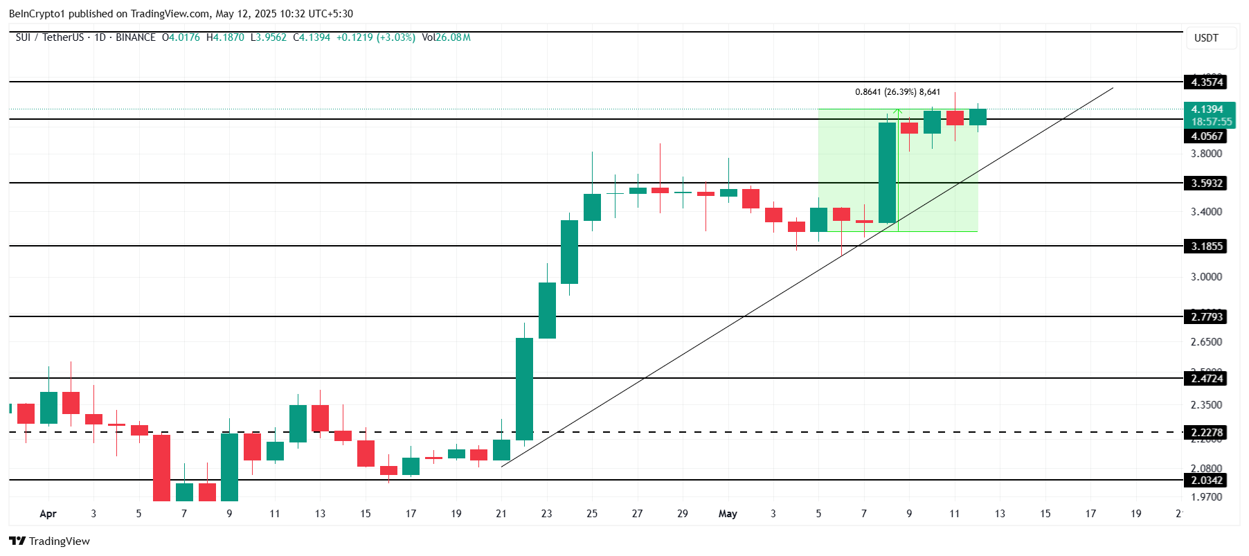 Both SUI and Solana have seen moderate growth over the past week, with SOL rising 22% and SUI gaining 26%. Trading at $4.13, SUI is attempting to secure $4.05 as support following a month-long uptrend. The inability to hold this level could indicate challenges in sustaining growth.