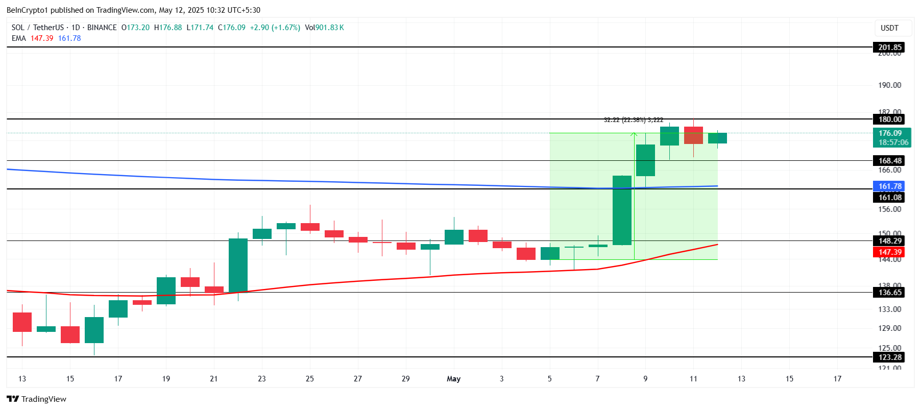 Meanwhile, Solana is trading at $176 and is on the verge of ending its ongoing Death Cross. However, the price has failed to breach the critical $180 resistance, which is necessary for reaching $200. Until this level is overcome, Solana may struggle to regain full bullish momentum.