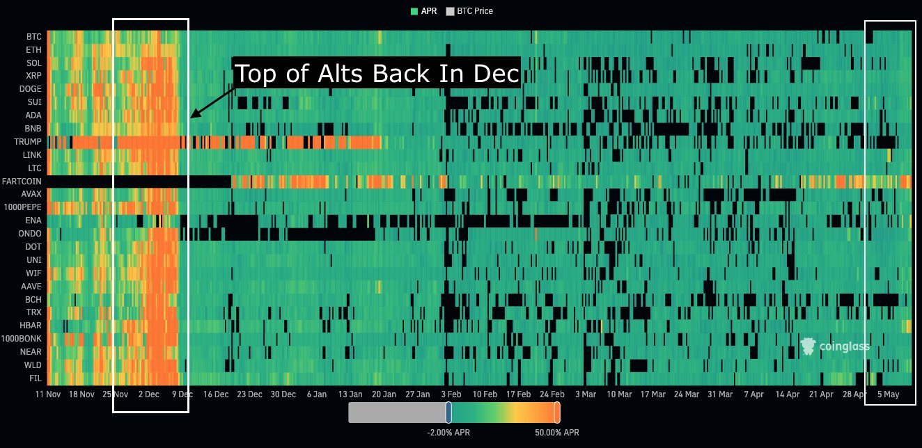 Broader market context corroborates the sense of a maturing impulse. A separate CoinGlass heat-map of perpetual-swap annualised funding rates that Dom shared plots twenty-seven large-capitalisation altcoins from November through May. The graphic highlights two periods – late November to 9 December and the first weeks of May.