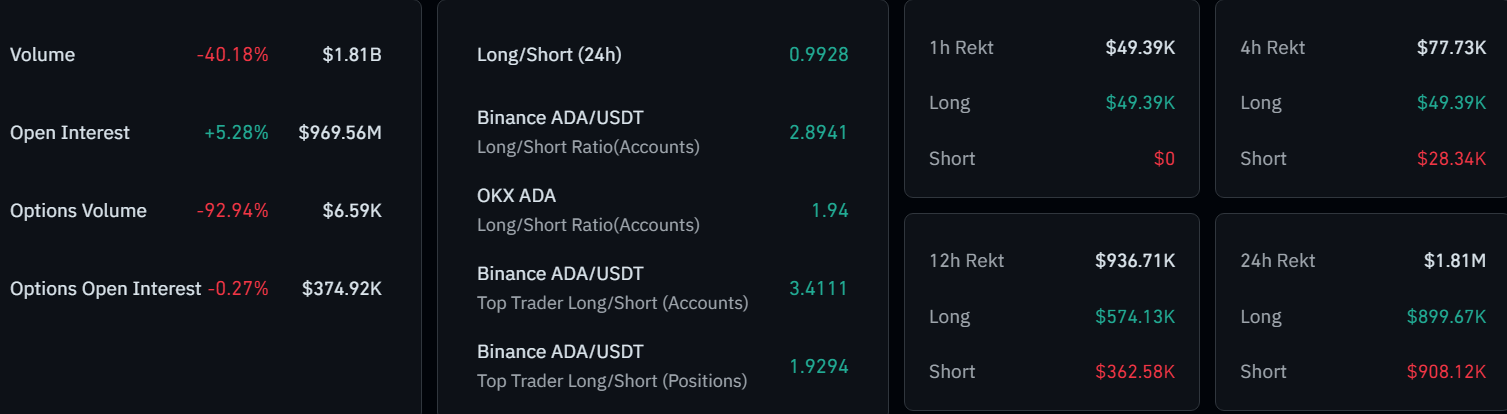Open interest in Cardano futures has reached $987 million, approaching the $1 billion mark. This represents a 6.61% increase in 24 hours, despite lower spot trading volume. It shows that traders are entering new positions in anticipation of further Cardano price movement.