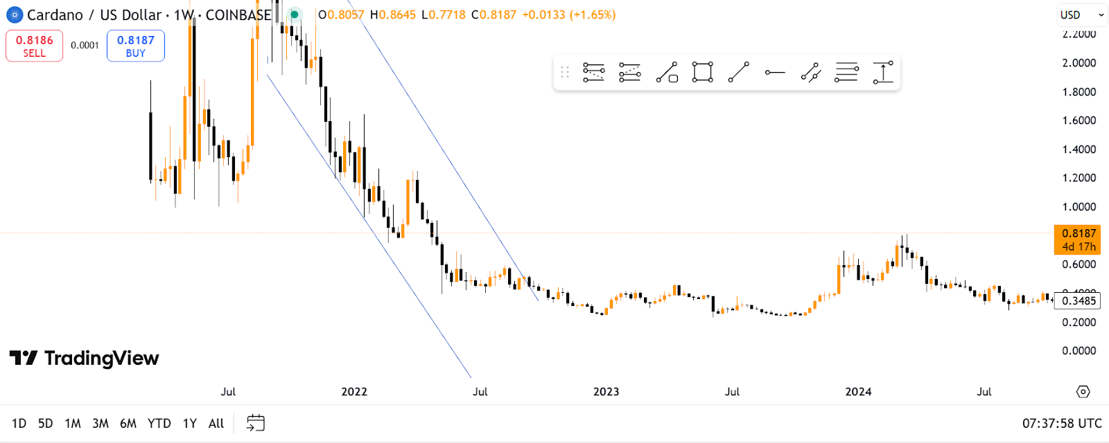 Cardano price is showing signs of a possible extended rally, driven by a strong technical setup and rising market confidence. The price has recently broken out of a long-term descending channel that was formed after reaching its all-time peak high of $3 in 2021.