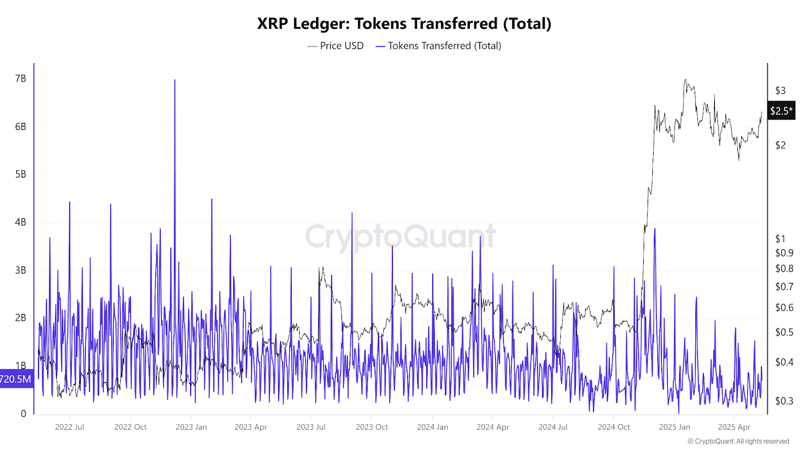 The notable shift in market sentiment has seen the broad crypto market record significant on-chain transaction activities in recent times. XRP has seen a total of 720,503,612 XRP move across multiple accounts within 24 hours, according to data from crypto analytics platform CryptoQuant.