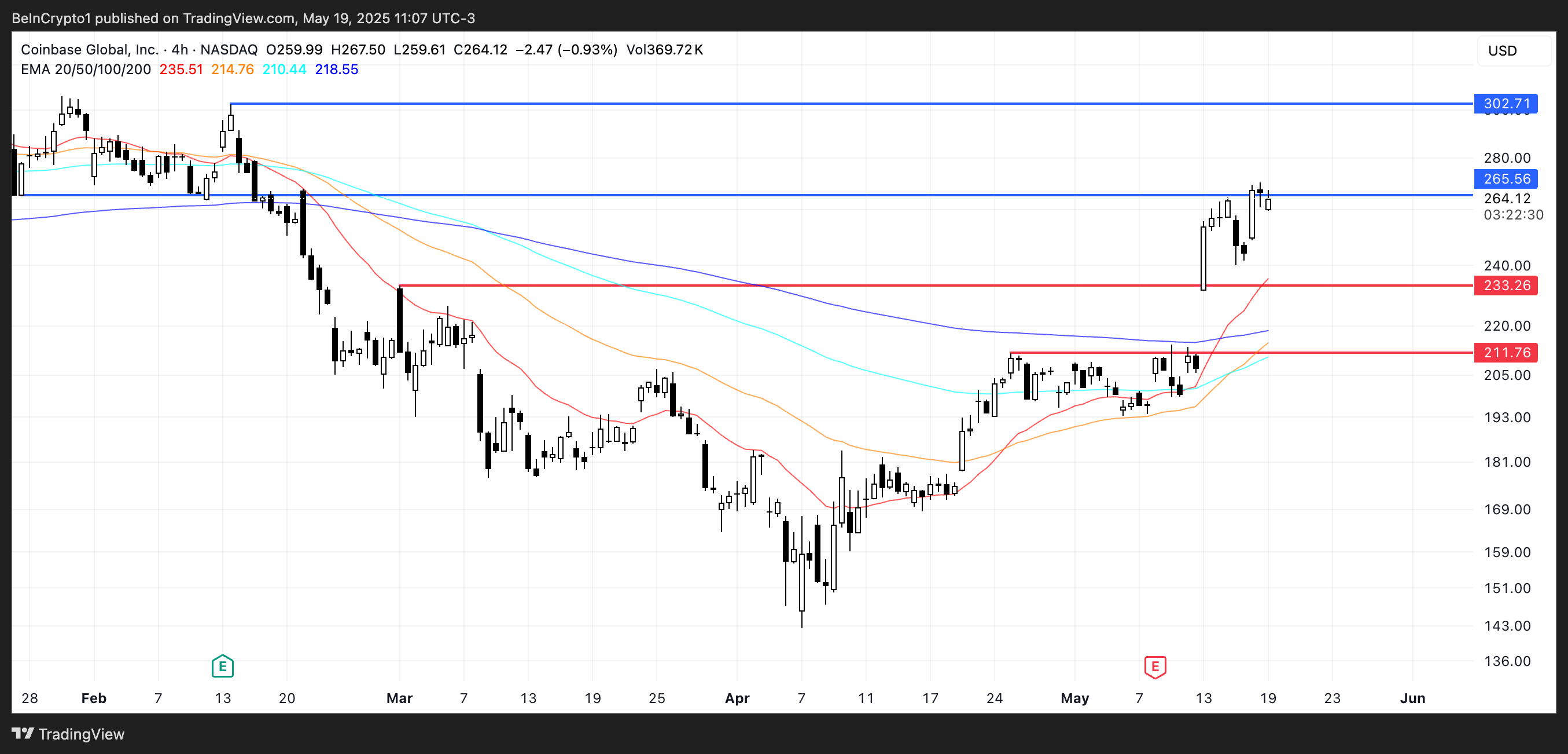 Technically, COIN faces resistance near $265, with bullish EMA lines still intact.