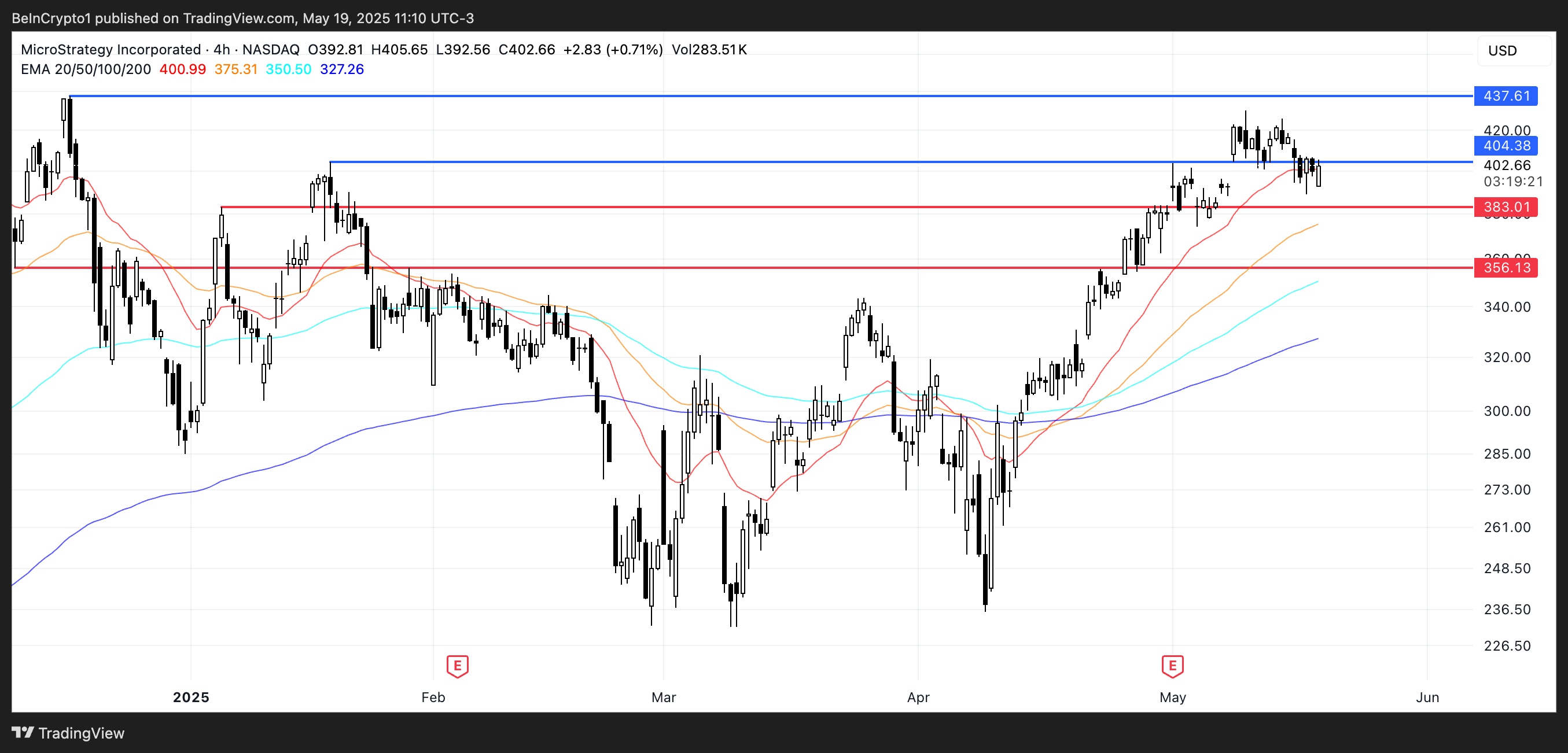 If the resistance is broken, MSTR could push toward the next target at $437.61. However, if the trend reverses and selling pressure increases, a drop to the $383 support is possible.