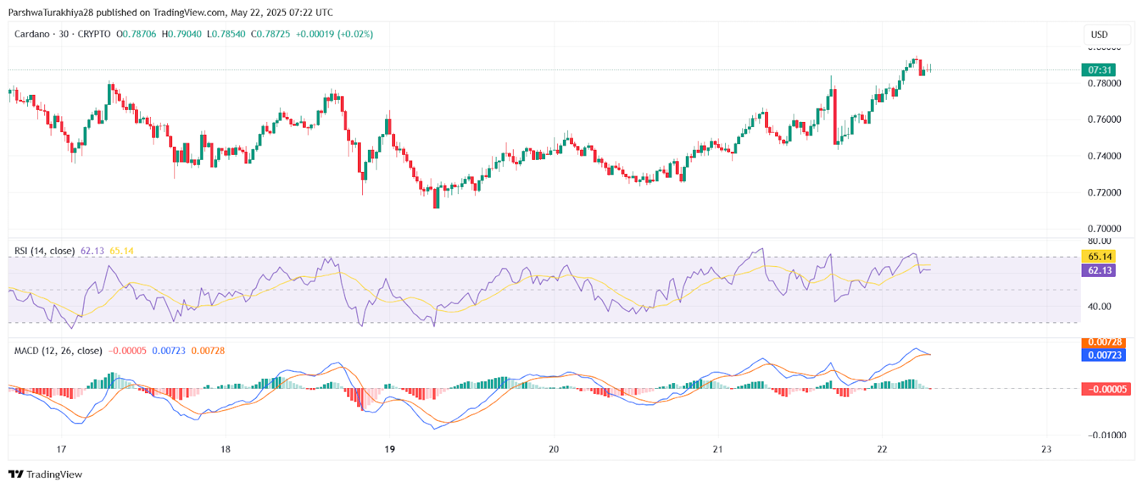 From a pattern structure standpoint, ADA has invalidated the previous descending wedge and surged into the $0.78–$0.80 resistance band. However, with RSI approaching 70 and MACD lines beginning to flatten, momentum may be due for a short cooldown.