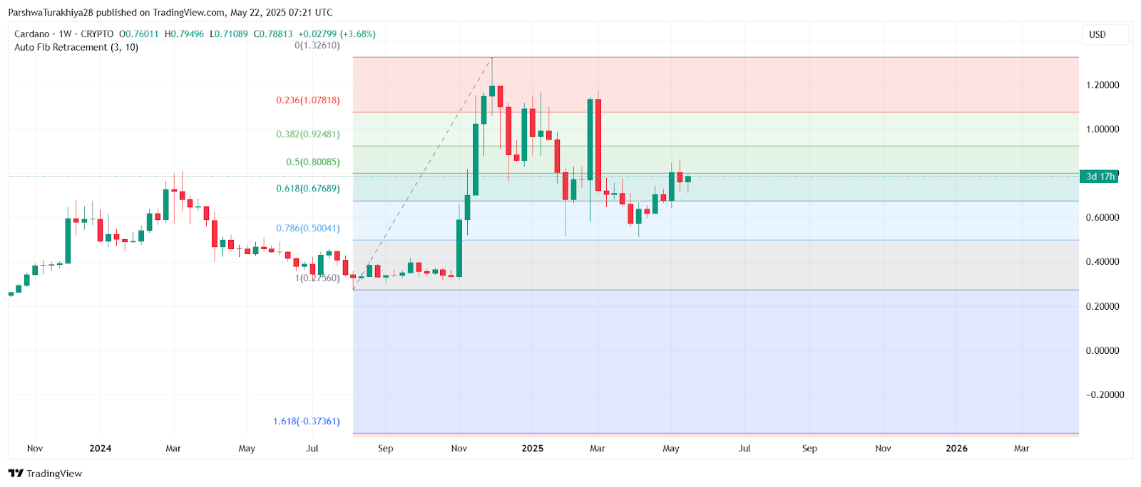 From a weekly perspective, the Cardano price volatility remains elevated but constructive. The price is currently pushing against the 0.5 Fib level with strength, having already cleared the 0.618 retracement at $0.676. Holding above $0.78 on higher timeframes will be vital for continued upward momentum.
