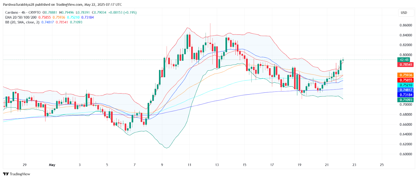 On the 4-hour chart, ADA has decisively broken past the 20, 50, and 100-EMA zones, reclaiming ground above $0.75 and $0.78. Price action remains supported by the middle Bollinger Band at $0.748, while the upper band currently caps upside at $0.785. The Cardano price update also highlights increased trading volume, signaling buyer participation near the recent breakout zone.