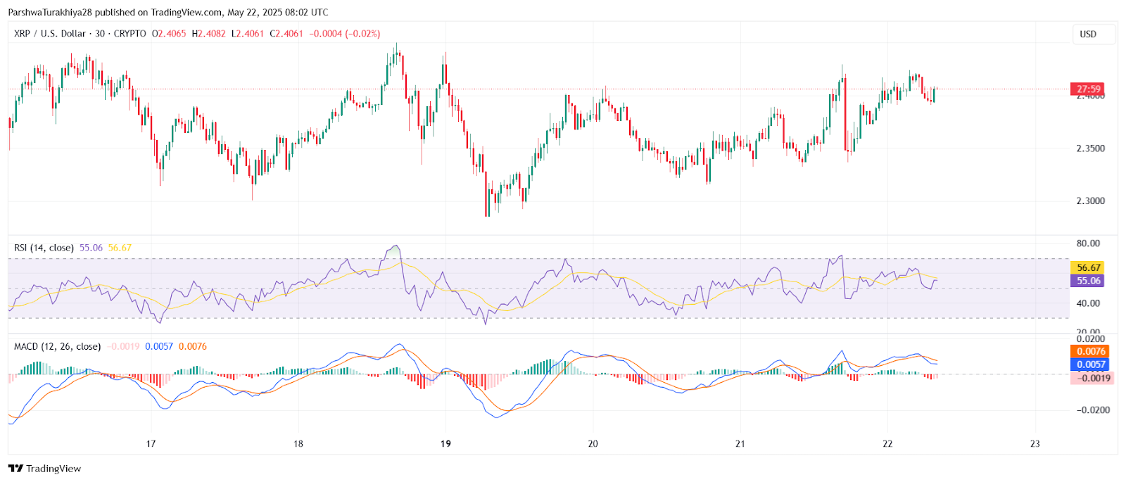 Looking ahead to May 23, traders are eyeing a breakout setup as XRP price volatility compresses near the apex of a wedge. If volume surges and price sustains above $2.45, a quick move toward $2.50 and $2.67 (Fibonacci resistance) becomes likely.