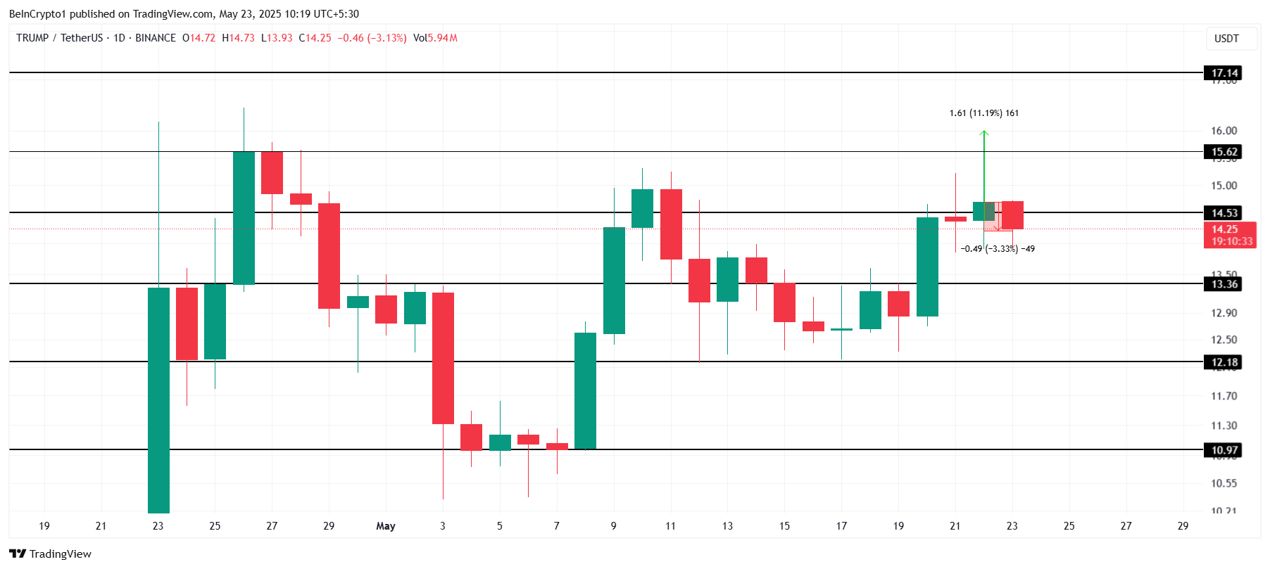 For over a month, TRUMP has struggled to secure support at $14.53. This is making it difficult for the coin to breach the $15.62 resistance level. Even if the coin recovers, it is likely to remain in a consolidation range, hovering between $14.53 and $15.62. This price action indicates limited upside potential in the short term.