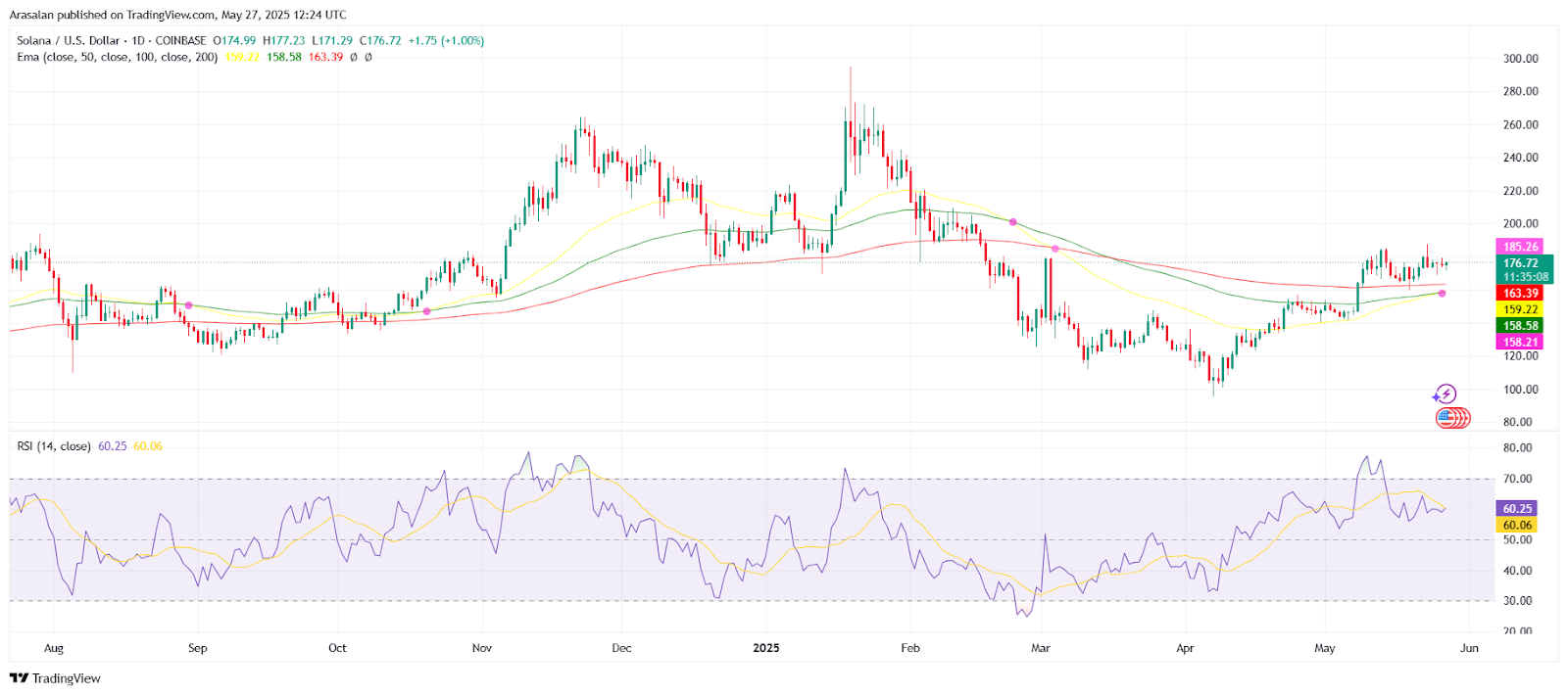 Now, the RSI stands at 60.25, showing a slight sign of buyers taking over. This value suggests that Solana is not yet fully overbought (it is below 70), but it is approaching this threshold.