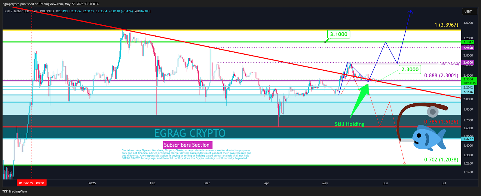 The price structure shows XRP breaking above a long-term descending red trendline. This breakout came with strong volume, hinting at bullish sentiment. The token now trades at approximately $2.30, with visible support from the 0.888 Fibonacci retracement level near $2.30. EGRAG noted,