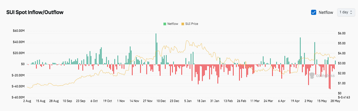 On-chain data shows that strong net outflows since January led to price declines. However, recent periods of inflow align with short-term recoveries. Historically, inflows above $20 million precede rallies. This suggests that if inflow momentum returns, SUI could revisit its $4.50–$5.00 range soon.