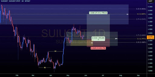 Further breaking down his analysis, the analyst delved into several key technical insights that support a bullish outlook for SUI. Firstly, he pointed to a Market Structure Shift (CH) that occurred back in April, describing it as a critical “change of character” that marked the beginning of a bullish reversal.