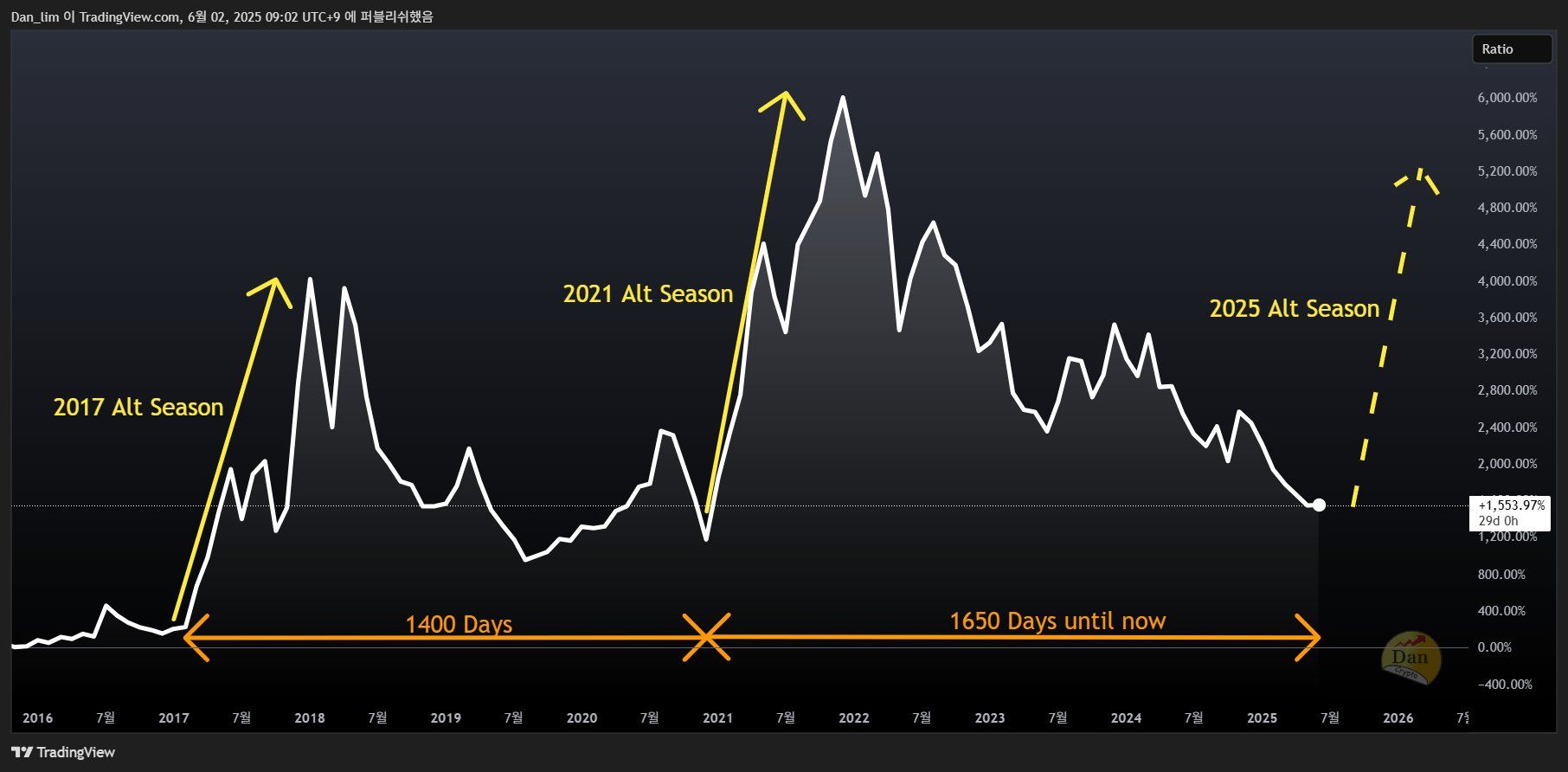 “Let me remind you — in the previous cycle (2020 to 2021), during a 300-day altcoin season, total altcoin market cap surged about 1300%. If this time, due to spot ETFs and institutional capital, the cycle stretches longer than usual, then we must also consider that it may not end in 2025, but could last even longer,” Dan said.