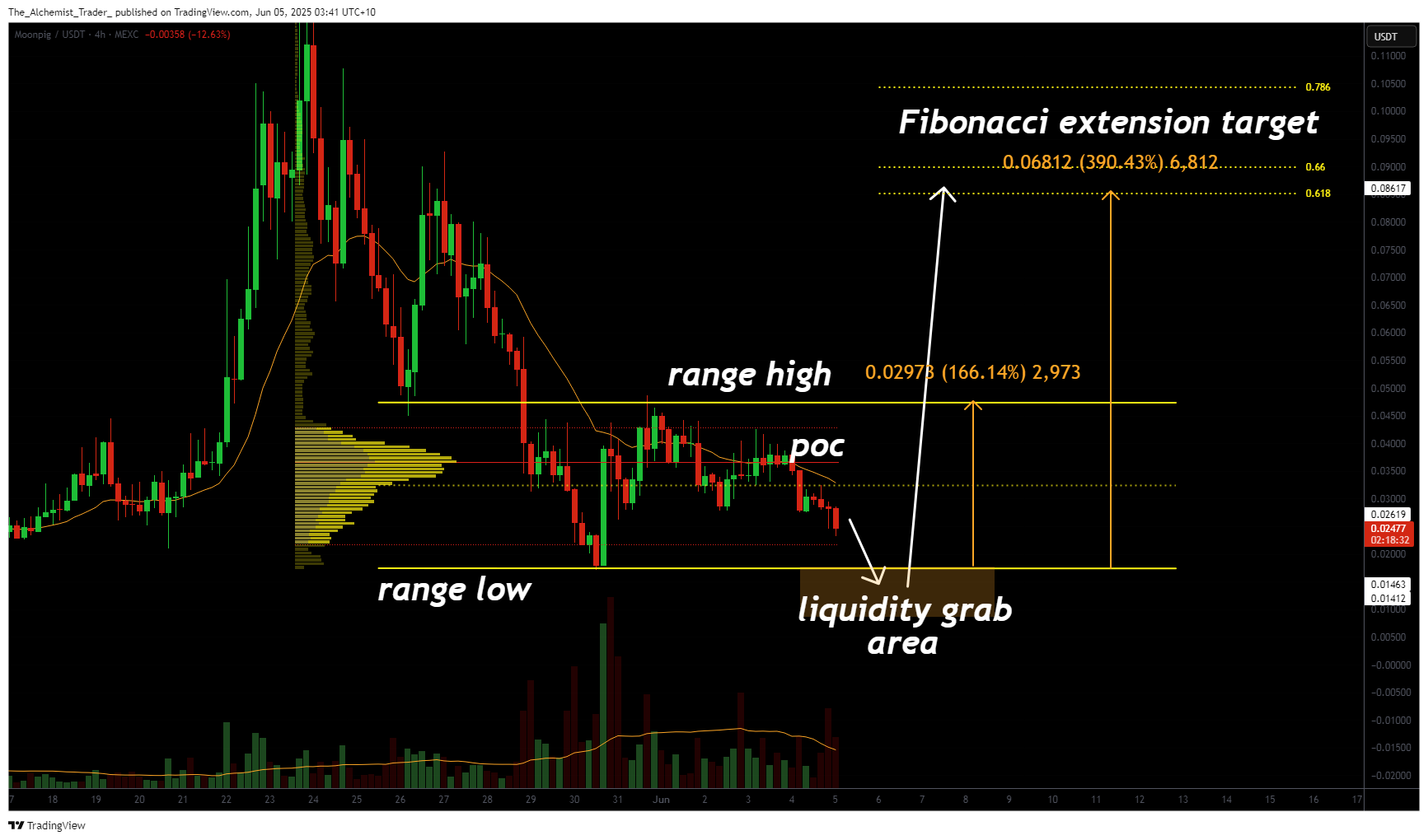 - Fibonacci Extension Target: If the range high is breached with momentum, the next target lies 390% higher based on Fibonacci extension projections.