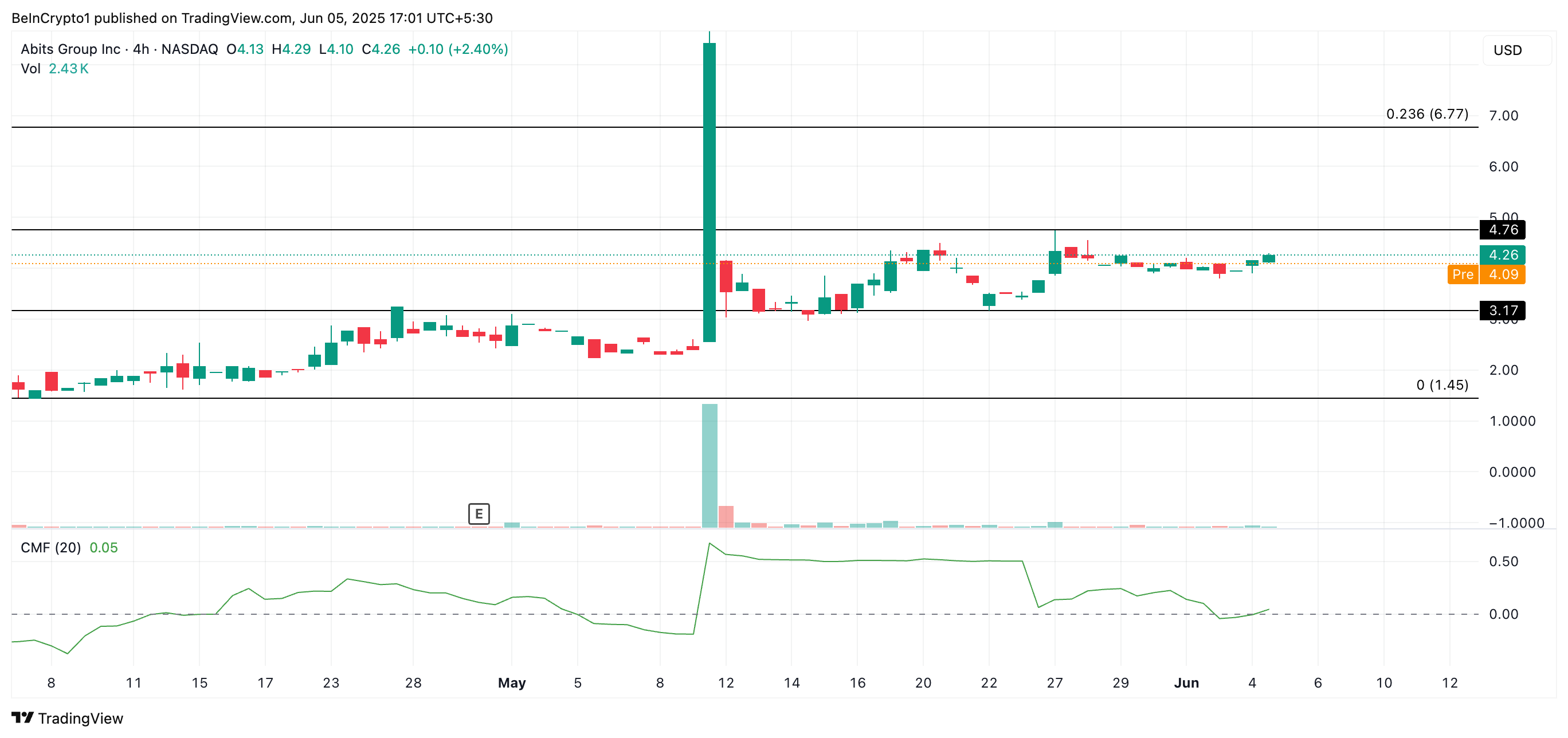 ABTS exchanges hands at $4.09, up 7% today. On the four-hour chart, the stock’s Chaikin Money Flow (CMF) has bounced off its neutral line and is now in an upward trend. It currently stands at 0.05, reflecting the growing buying pressure.