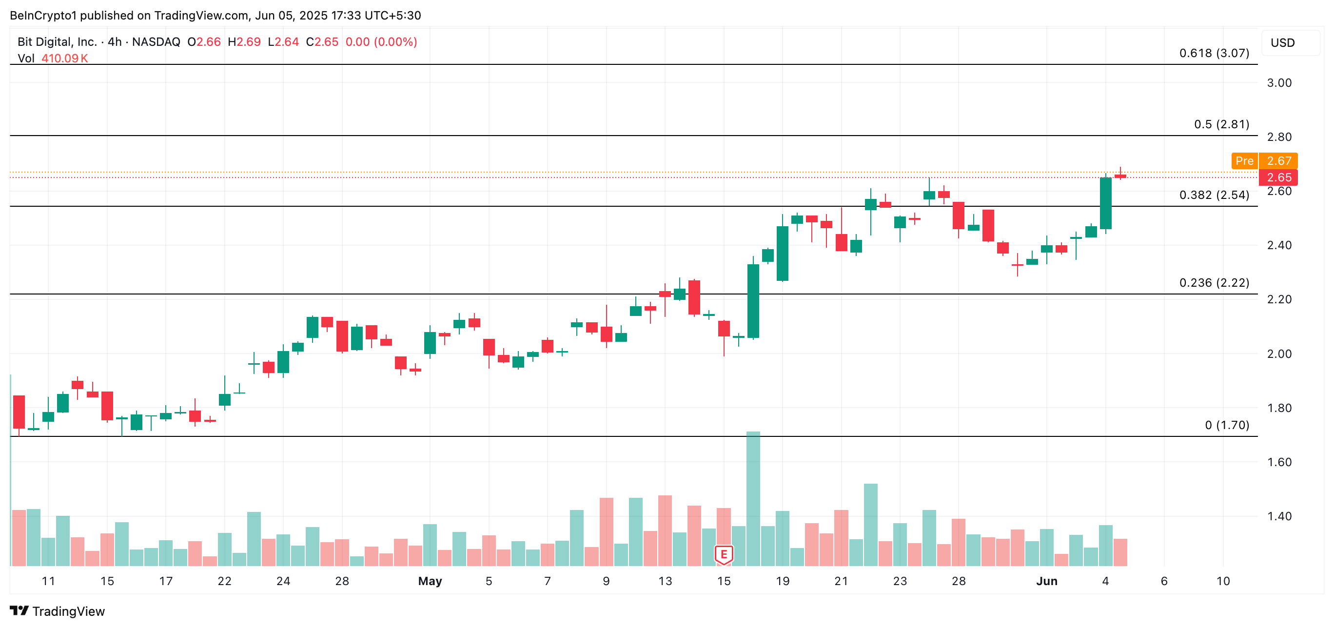 BTBT trades at $2.67, up 7% pre-market. During the review period, the stock’s trading volume also increased.