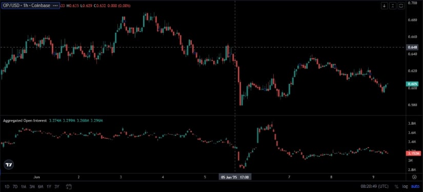 On the hourly chart, OP/USD has demonstrated heightened volatility throughout early June. A sharp rally to approximately $0.67 on June 3 was quickly followed by an accelerated decline, culminating in a breakdown below $0.62 on June 5. This move was accompanied by a noticeable surge in aggregated open interest, indicating an increase in speculative trading activity, likely from short positions or forced liquidations.