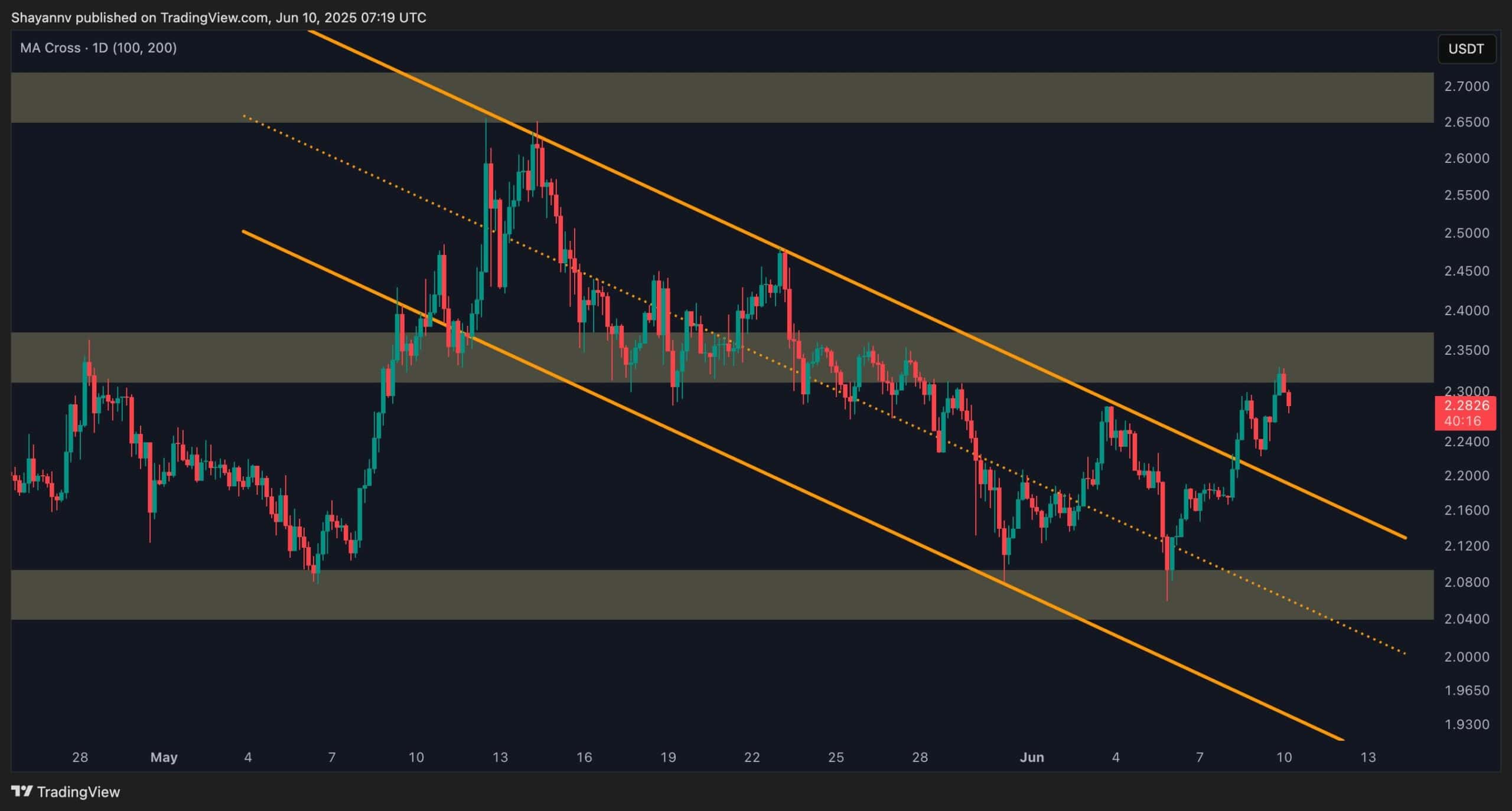 A decisive break above this level could trigger a fresh wave of buying pressure, propelling the price toward the upper boundary of the long-standing wedge pattern near $2.5. For now, subdued momentum suggests a higher likelihood of short-term consolidation within this tight range. A breakout, either above resistance or below support, will likely define the next major directional move.