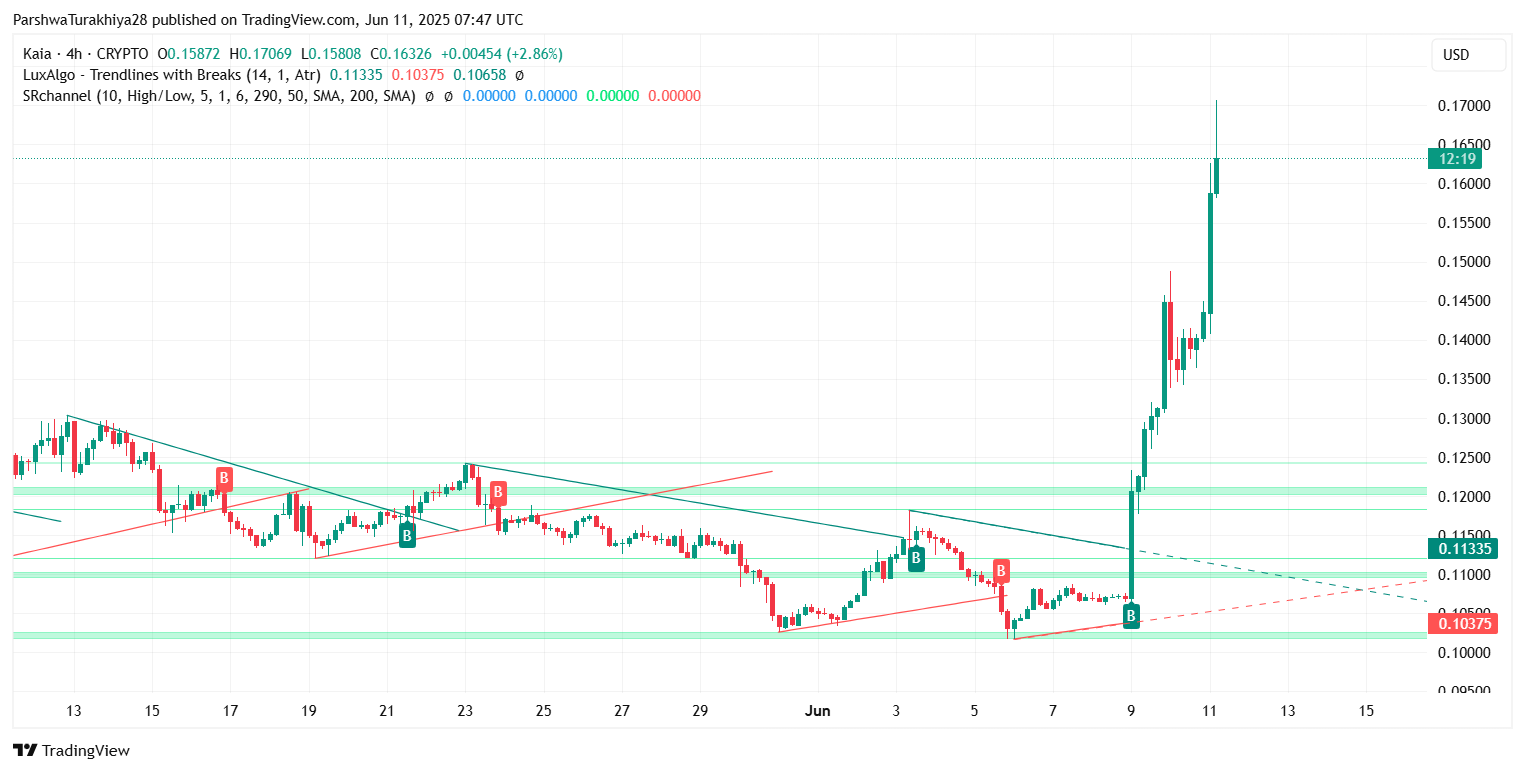Kaia has staged a clean breakout from a multi-month accumulation range, lifting off from the $0.10–$0.12 zone with vertical strength. On the 4-hour chart, the asset broke above multiple descending trendlines and supply blocks, propelling the Kaia price action to an intraday high of $0.1706.