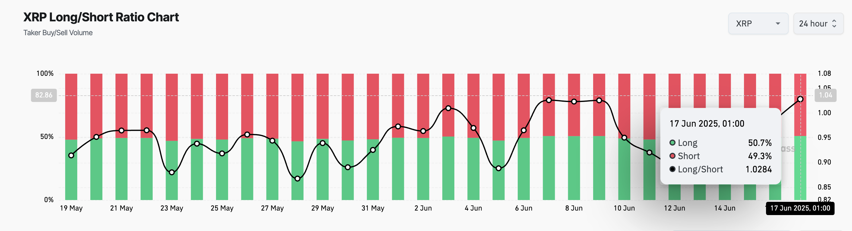 The Long/Short Ratio compares the number of long and short positions in a market. When an asset’s long/short ratio is above one, there are more long than short positions, indicating that traders are predominantly betting on a price increase.