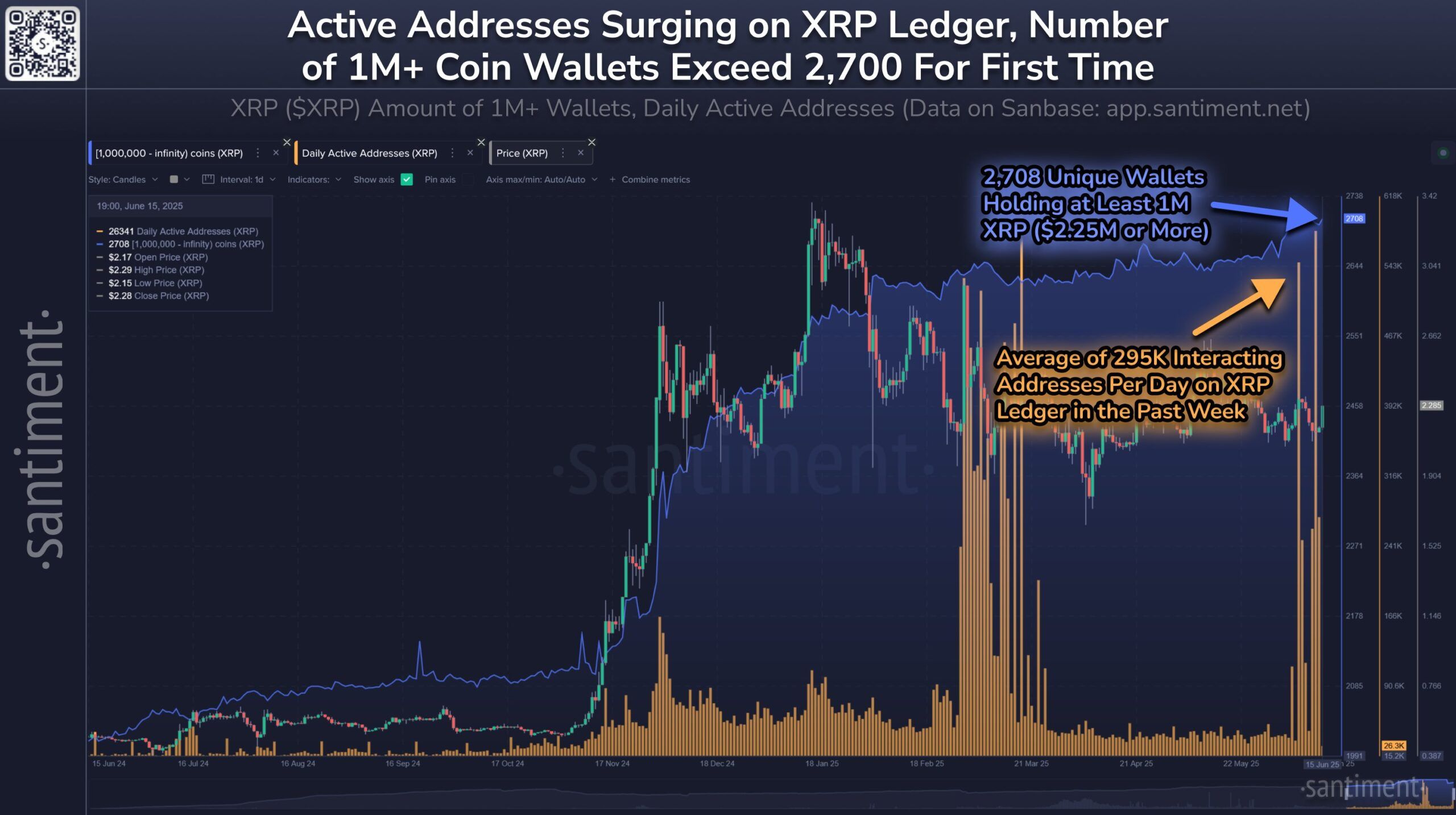 On-chain data has revealed a notable uptick in user activity on the XRP Ledger. According to on-chain analytics provider Santiment, the number of active XRP addresses has surged to an average of over 295,000 per day over the past week, starkly contrasting the 35,000–40,000 daily average seen over the last three months.
