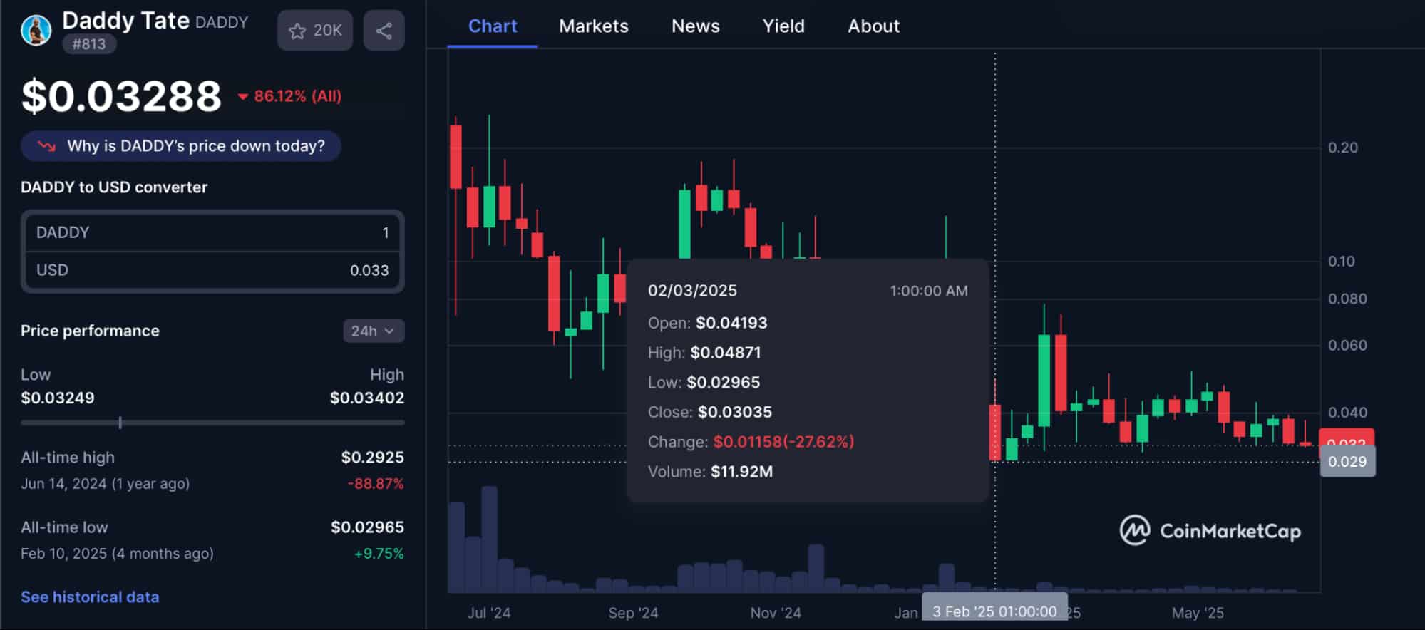 As things stand DADDY token is just $0.002 away from hitting its record lowest closing price of $0.03035 recorded back on February 3, 2025.