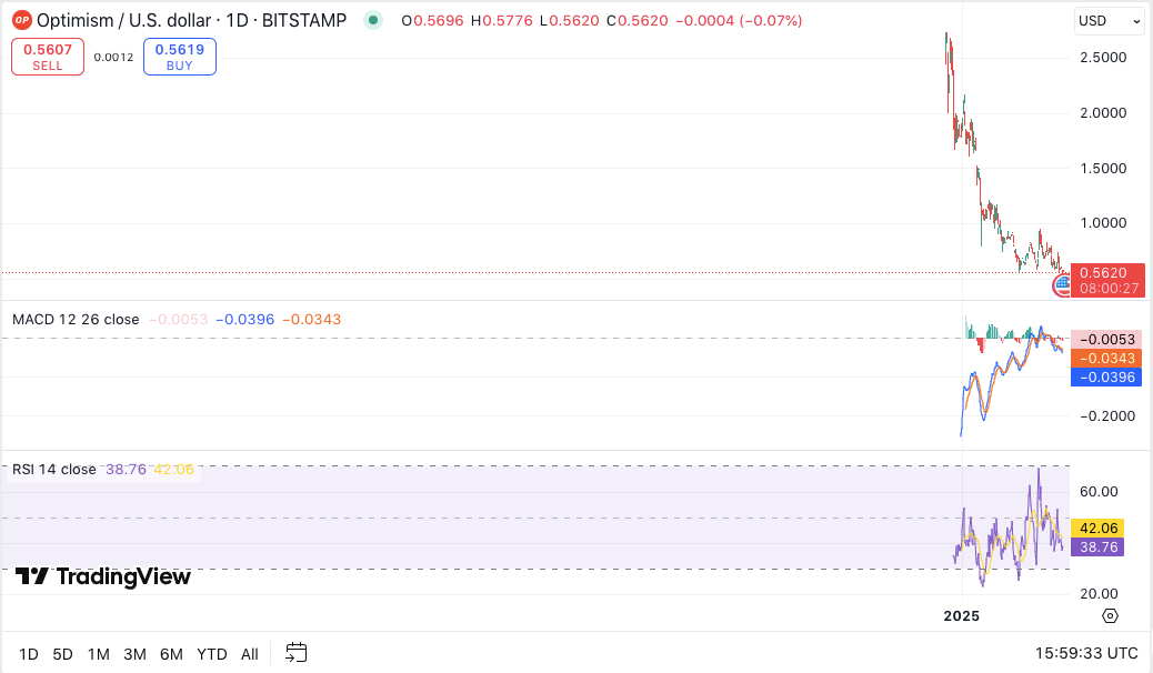 Currently, OP’s RSI stands at 38.76, just shy of oversold territory. If it continues rising toward the 50–60 range, it may confirm a shift in sentiment. Despite early signs of a reversal, the Moving Average Convergence Divergence (MACD) remains in negative territory.