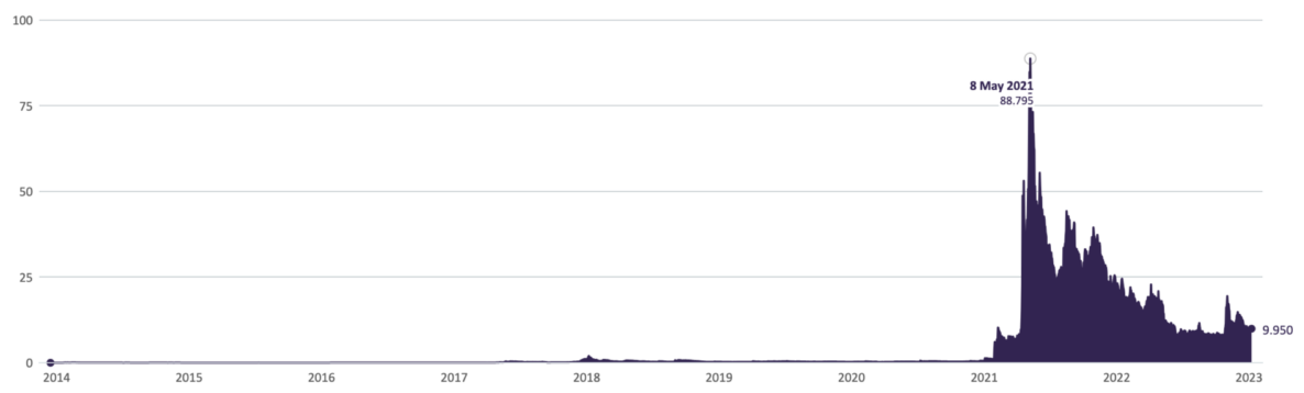 - The coin saw gains in April, reaching as high as $0.7177, and in May, it recaptured the $1 mark, reaching a peak price of $1.38.