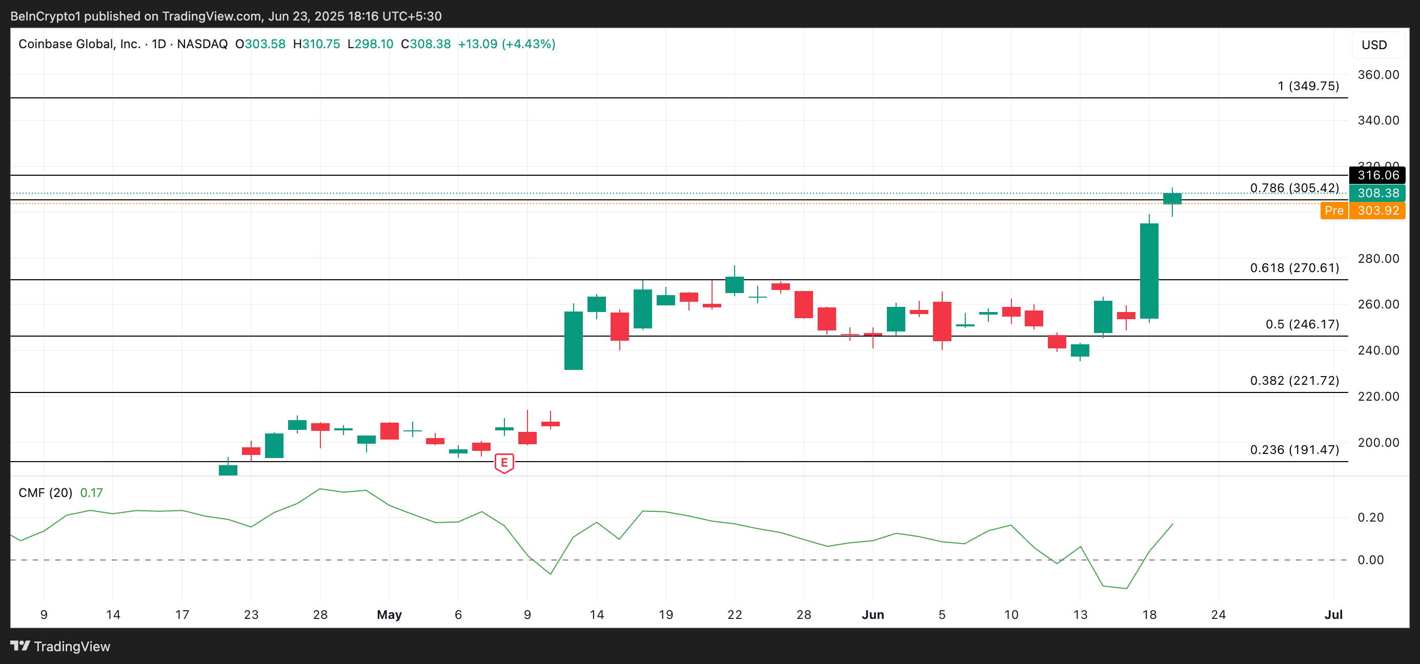 This development has bolstered COIN’s price, up 4% in pre-market trading. As of this writing, its Chaikin Money Flow (CMF) is at 0.17 and in an uptrend, highlighting the demand for COIN.