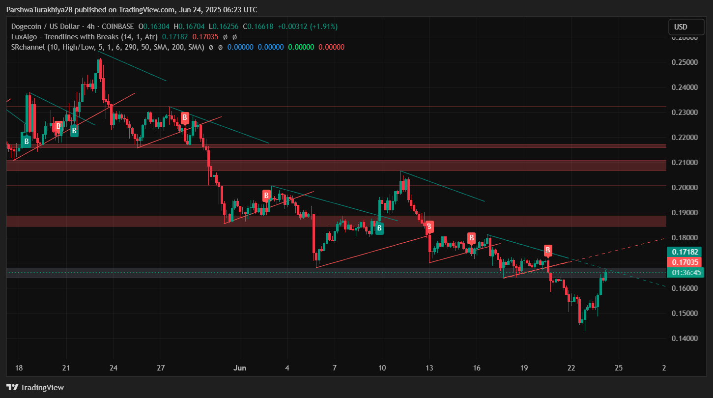 The Dogecoin price is showing renewed upward momentum after defending the $0.14 liquidity pocket, now climbing back above $0.166. This recovery aligns with a bullish CHoCH (Change of Character) on the 4-hour chart, confirmed just below the $0.15 mark. Price is currently testing a local supply block near $0.1665–$0.179, and a clean breakout above this region may flip short-term structure.