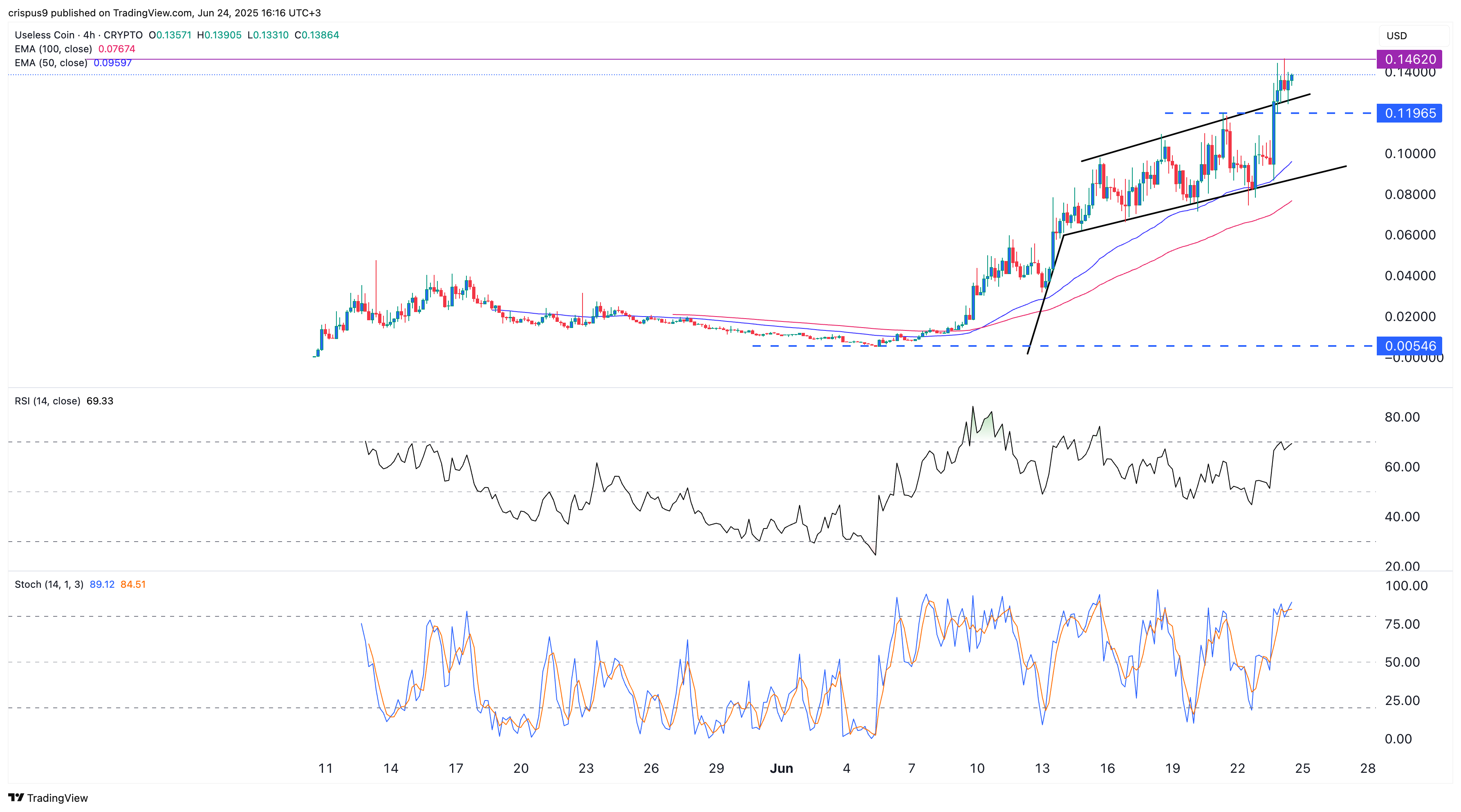 The four-hour chart shows that Useless Coin has been in a strong bull run over the past few weeks. It has climbed from a low of $0.00546 in June to a high of $0.1462.