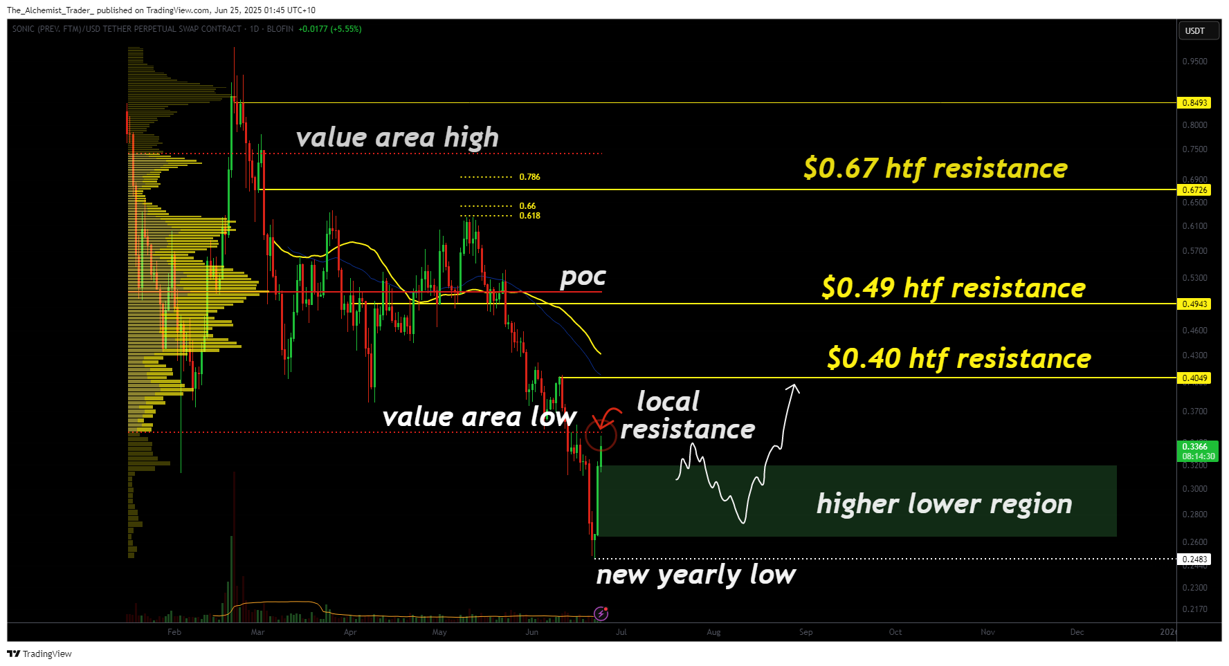 Sonic’s drop to $0.24 marked a key inflection point, a new yearly low that could represent a final flush if the level holds. The recent rally into the value area low is technically significant, but so far, it lacks the volume and structure needed to confirm a sustained trend shift.