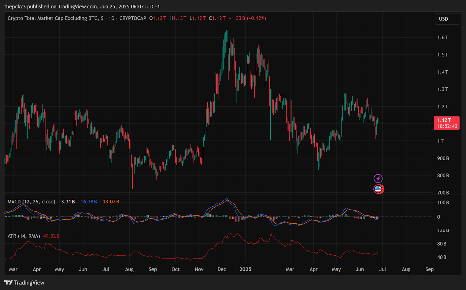 The Total 2 chart adds further insight, revealing that the market is currently hovering near the $1.12 trillion mark–displaying significant historical support near the $1 trillion level, where the market has previously found buyers.