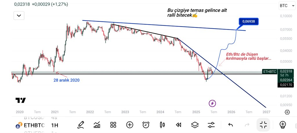 YILDIZ emphasized that the key trigger for altseason will be the breakout of the descending trendline on the ETH/BTC chart. “When Ethereum rises against Bitcoin, that’s when the real altcoin movement begins,” he said.