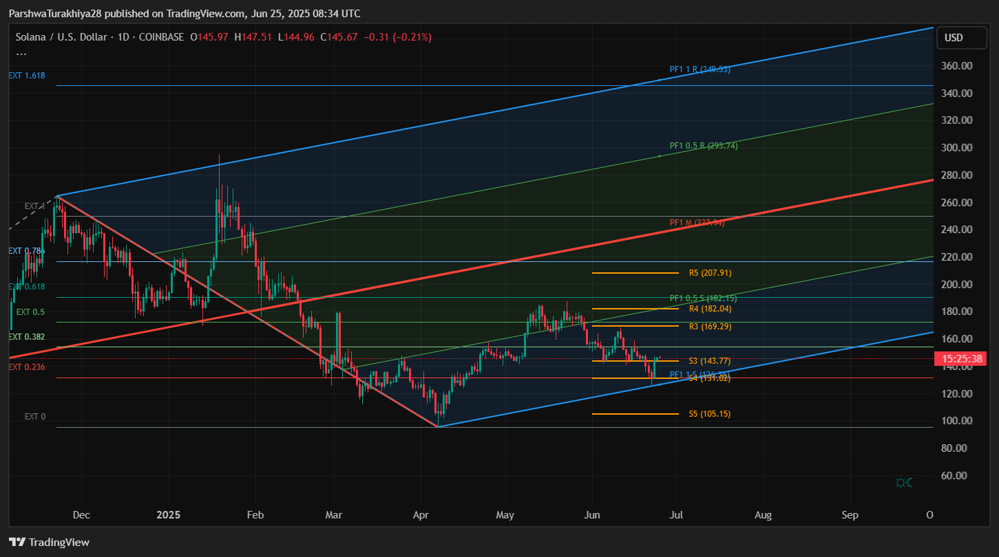 On the 1-day chart, SOL remains range-bound within a descending Fibonacci channel. The upper boundary of this range sits near $169.29, while pivot support lies at $143.77 (S3 level). For any medium-term bullish structure to resume, price needs to decisively break above $151 and flip the trendline.